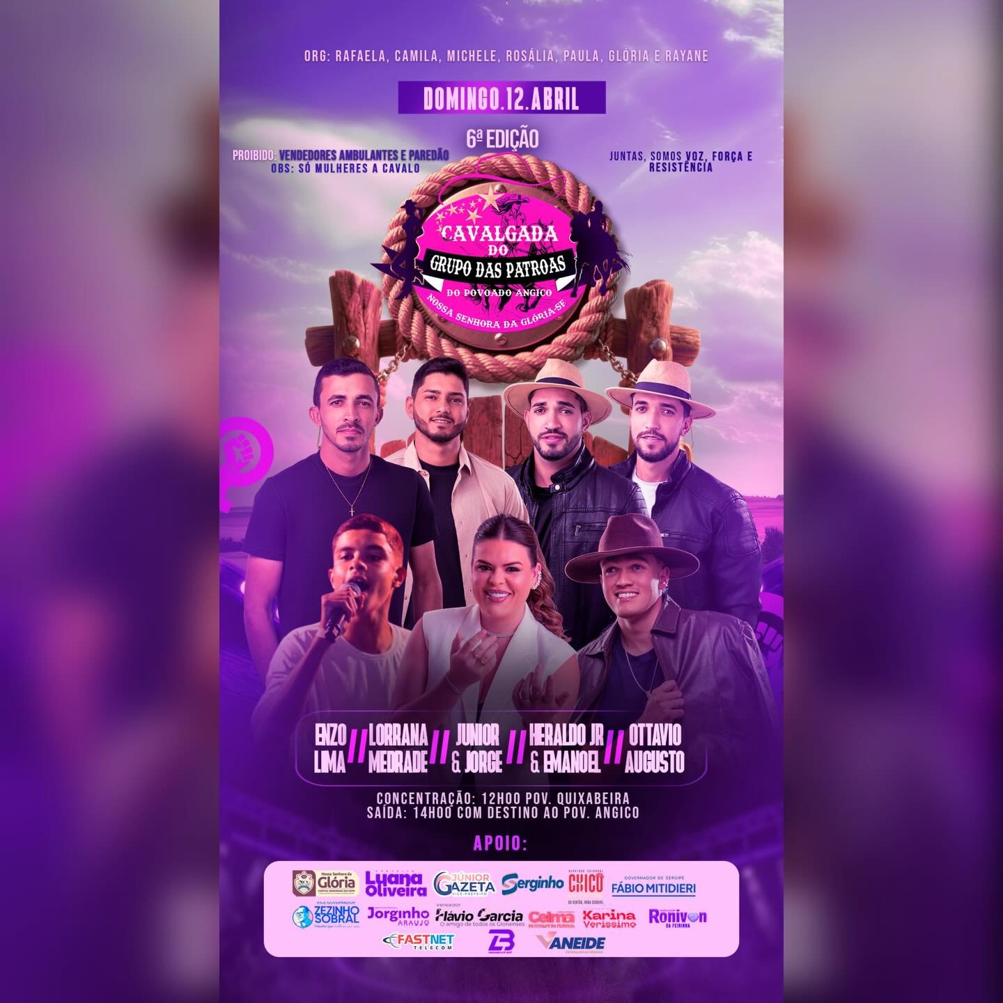 Description: A Cavalgada das Patroas do Angico é um evento tradicional que celebra a cultura sertaneja e a força feminina no município de Nossa Senhora da Glória. Idealizada e organizada por um grupo de mulheres da região, a cavalgada reúne cavaleiras, amazonas e apaixonados por cavalgadas em um percurso que valoriza as paisagens rurais e fortalece os laços de amizade e confraternização entre os participantes. O evento tem concentração no Povoado Quixabeira e segue em direção ao Povoado Angico, onde acontece a chegada com programação festiva, incluindo música ao vivo, comida típica e celebração das tradições locais. A iniciativa destaca o protagonismo feminino no universo das cavalgadas, promovendo integração, lazer e o fortalecimento da cultura nordestina no Alto Sertão Sergipano .