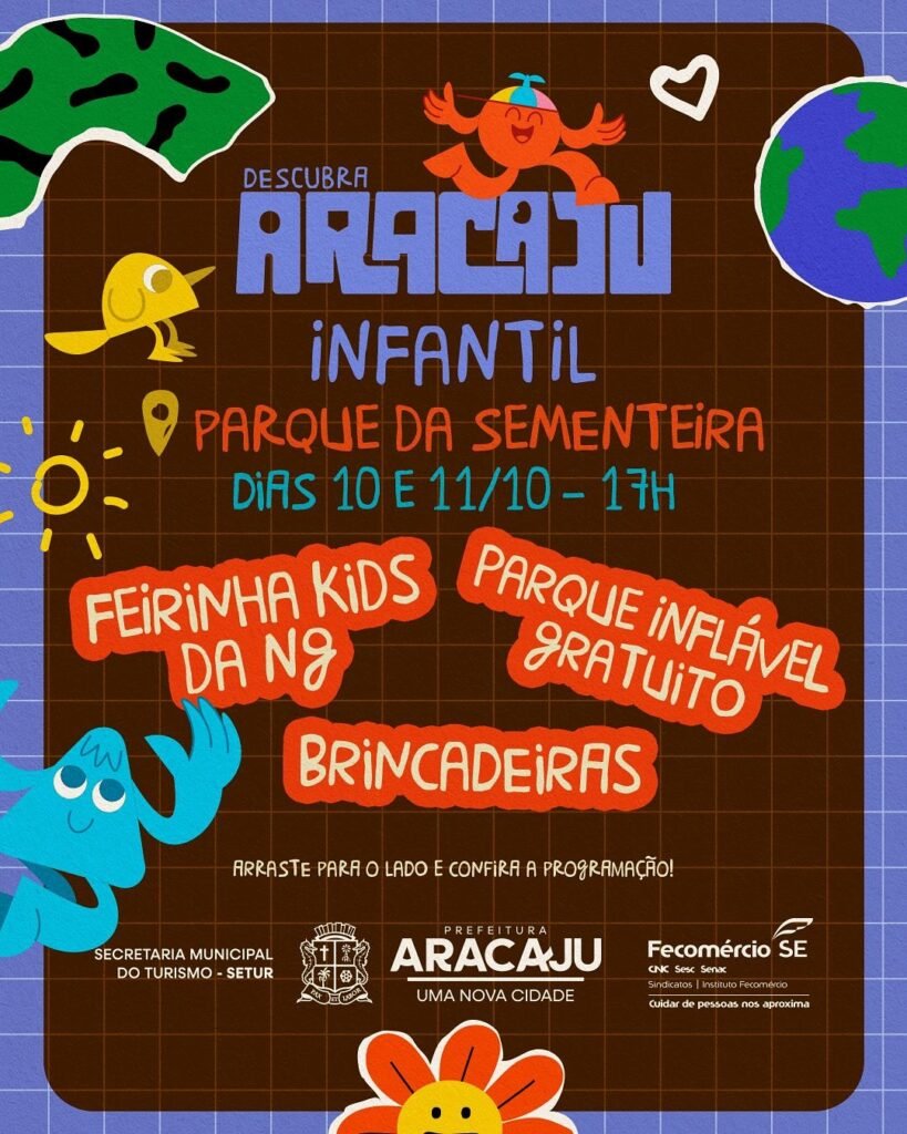 DESCUBRAARACAJU 👧 INFANTILPARQUE DA SEMENTEIRA📅 DIAS 10 E 11/10 – 17H 🛍️ FEIRINHA KIDSDA N9 🎪 PARQUE INFLÁVEL🎫 GRATUITO 🎈 BRINCADEIRAS ⬅️ ARRESTE PARA O LADO E CONFIRMA A PROGRAMAÇÃO! 🏛️ SECRETARIA MUNICIPAL DO TURISMO – SETUR 🏙️ PREFEITURA DE ARACAJUUMA NOVA CIDADE 🤝 Fecomércio SECNC SESI SENAISindicatos | Instituto Fecomércio https://www.instagram.com/setur.aracaju/